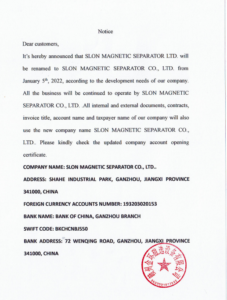 Настоящим сообщаем, что компания SLON MAGNETIC SEPARATOR LTD. будет переименована в SLON MAGNETIC SEPARATOR CO., LTD. с 5 января 2022 г., в соответствии с потребностями развития нашей компании. Весь бизнес продолжит вести компания SLON MAGNETIC SEPARATOR CO., LTD. . Во всех внутренних и внешних документах, контрактах, названии счета-фактуры, имени счета и имени налогоплательщика нашей компании также будет использоваться новое название компании SLON MAGNETIC SEPARATOR CO., LTD. Пожалуйста, проверьте обновленный сертификат об открытии счета компании.