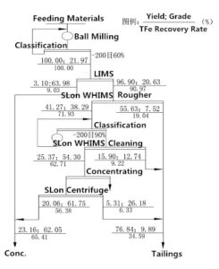 Столкнувшись с проблемами, мы решили их преодолеть и после большого количества исследований обнаружили, что технический процесс сильной магнитной сепарации и гравитационной сепарации может эффективно решить эту проблему. Поэтому с конца 2010 года мы сотрудничаем с заводом. На первом этапе измельчения руда измельчается примерно до -200 меш, что составляет 60%. Перед сильной магнитной сепарацией загружаемые материалы проходят через машины со слабым магнитом для удаления магнетитовых концентратов. И тогда металлическая смесь пройдет через Мокрый магнитный сепаратор высокой интенсивности (WHIMS) отливать части бедных руд. Гидроциклон обеспечивает разделение, используя разницу в гравитации между различными материалами. Этот шаг необходимо повторить, и материалы проходят второй этап измельчения. После этого обработанные материалы размером -200 ячеек (90%) перейдут на второй этап обработки.СЛон КАПИТСЫ для концентрации перед Центрифуги СЛон. Полученные концентраты окончательно отбираются путем гравитационного разделения на центрифугах SLon. Хвосты второй сильной магнитной сепарации и центрифуги разгружаются. Весь процесс сложен, но результат замечательный. Содержание готовой продукции составляет 62,05%, а степень извлечения железосодержащих концентратов достигает 65,41%, что создало большой экономический эффект для завода.