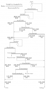 На обогатительной фабрике Дахуншань используется четырехстадийный технологический процесс, состоящий из измельчения, слабого магнетизма, сильной магнитной сепарации и обратной флотации. Учитывая особенности сырых руд, результат обратной флотации оказался неудовлетворительным. Поэтому несколько лет назад обратную флотацию заменили на встряхивающие столы. Однако вибросит имеет недостатки, заключающиеся в небольшой производительности и низкой степени извлечения железных концентратов. В 2010 году вели сотрудничество с SLon. Мы извлекли уроки из возникающих проблем и определили оптимальную схему сочетания. После нескольких экспериментов все получилось. Итак, они купили 72 Центробежные сепараторы SLon-2400and put the scheme of magnetic and gravity combined(Мокрый магнитный сепаратор высокой интенсивности+ Центробежный сепаратор)в практику. Подробная блок-схема показана на рисунке. Проект успешно работает уже почти 10 лет, начиная с 2010 года. В случае сырых руд с содержанием 35,61% содержание железного концентрата во всем процессе увеличено с 62-63% до 64-65%, а степень извлечения достиг 72,68%.